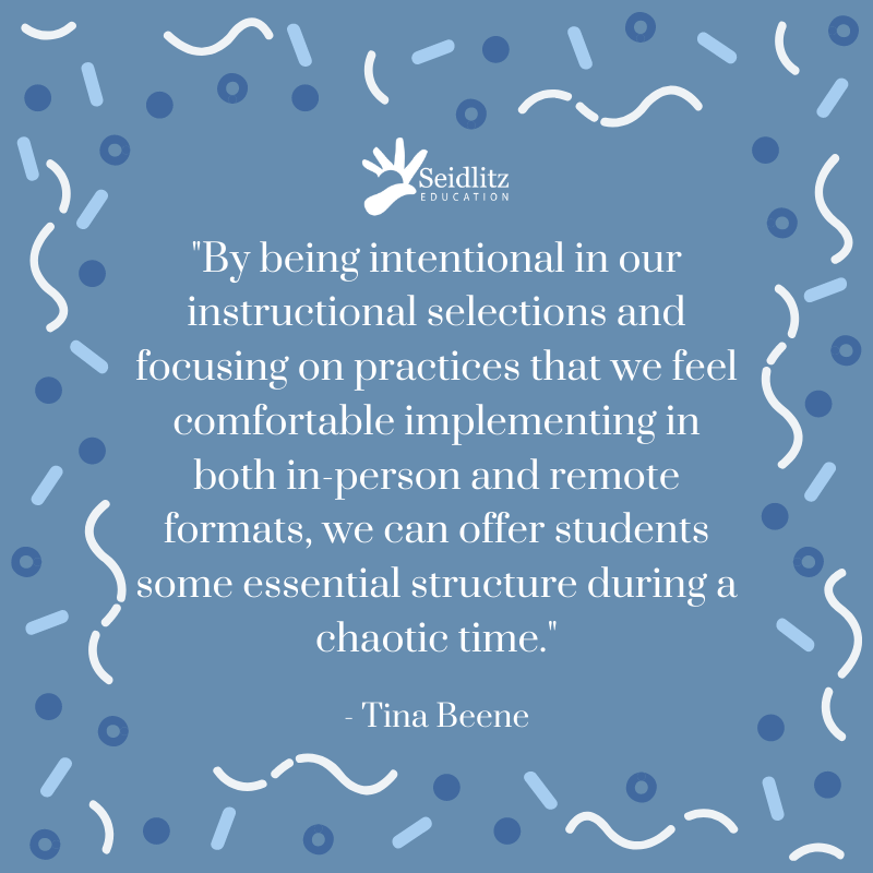 There’s a lot about our current reality — academic and otherwise — that frankly isn’t great. Taking a moment to focus on the opportunities it presents can be helpful for retaining some semblance of sanity. By being intentional in our instructional selections and focusing on practices that we feel comfortable implementing in both in-person and remote formats, we can offer students some essential structure during a chaotic time. Implementing those practices with grace for adults and students alike just might be the key to maximizing your own mental health while minimizing the number of back-to-school nightmares you endure.