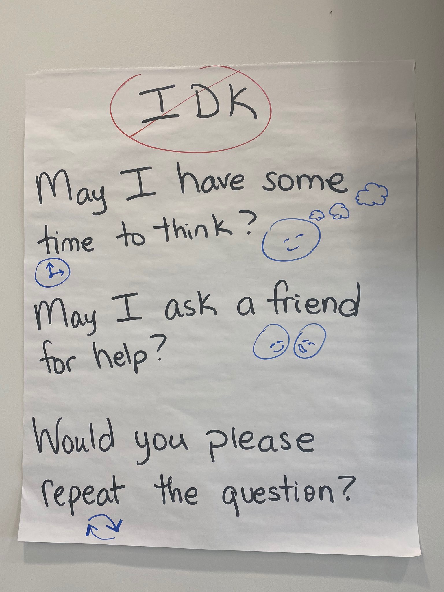 | We created an “Instead of IDK” poster together. Newcomer students and more proficient students alike were expected to use one of the sentences instead of saying “I Don’t Know” when called upon. We discussed the value in this. | No difference |
