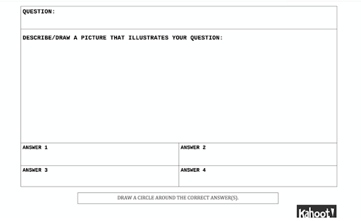 | Students used paper templates to offer one trivia question about themselves. I created a few Kahoot games with trivia about the students. | The students can still use paper to draw and write their trivia question. Or they can share about themselves on the class Flipgrid. I can still create the Kahoot games. |